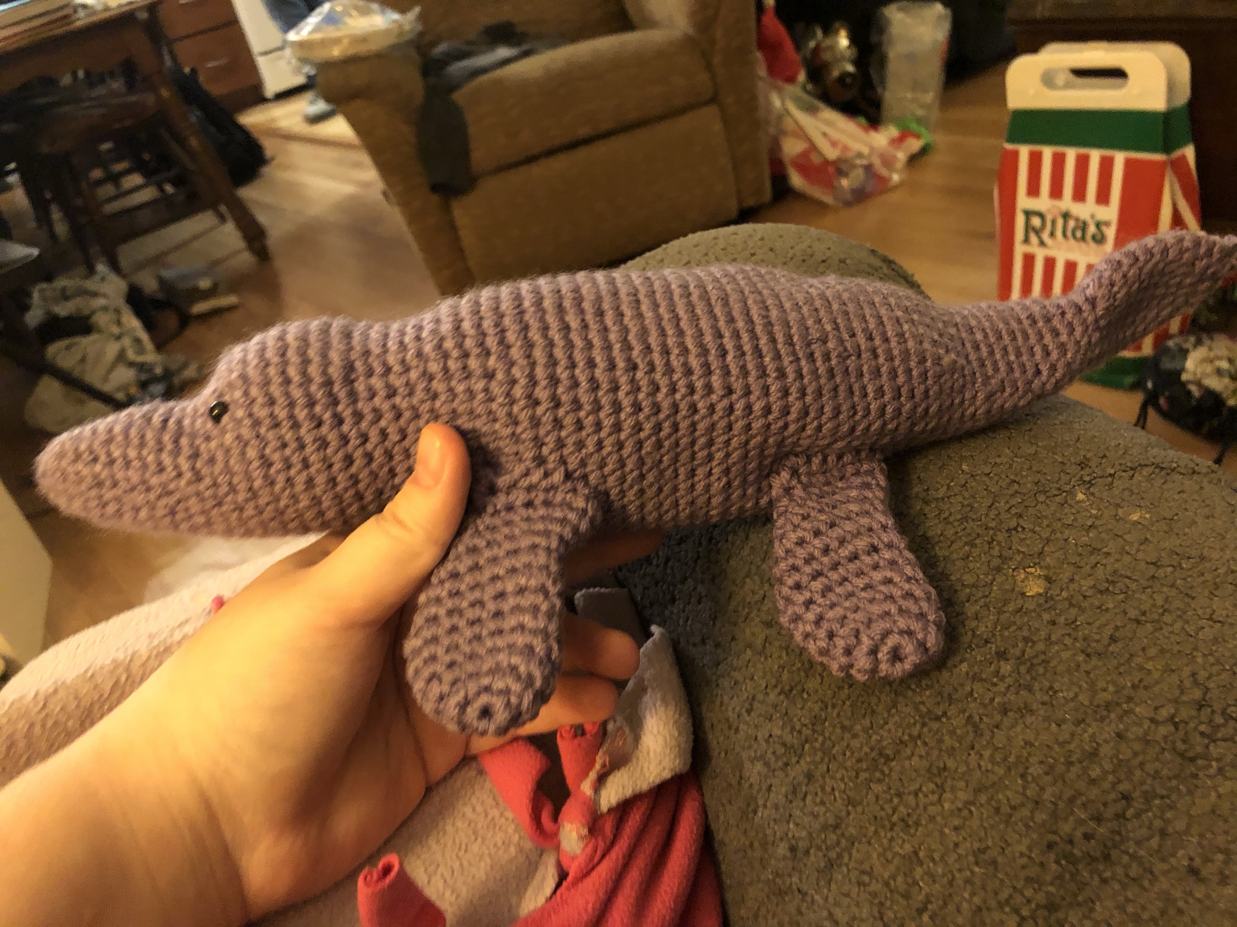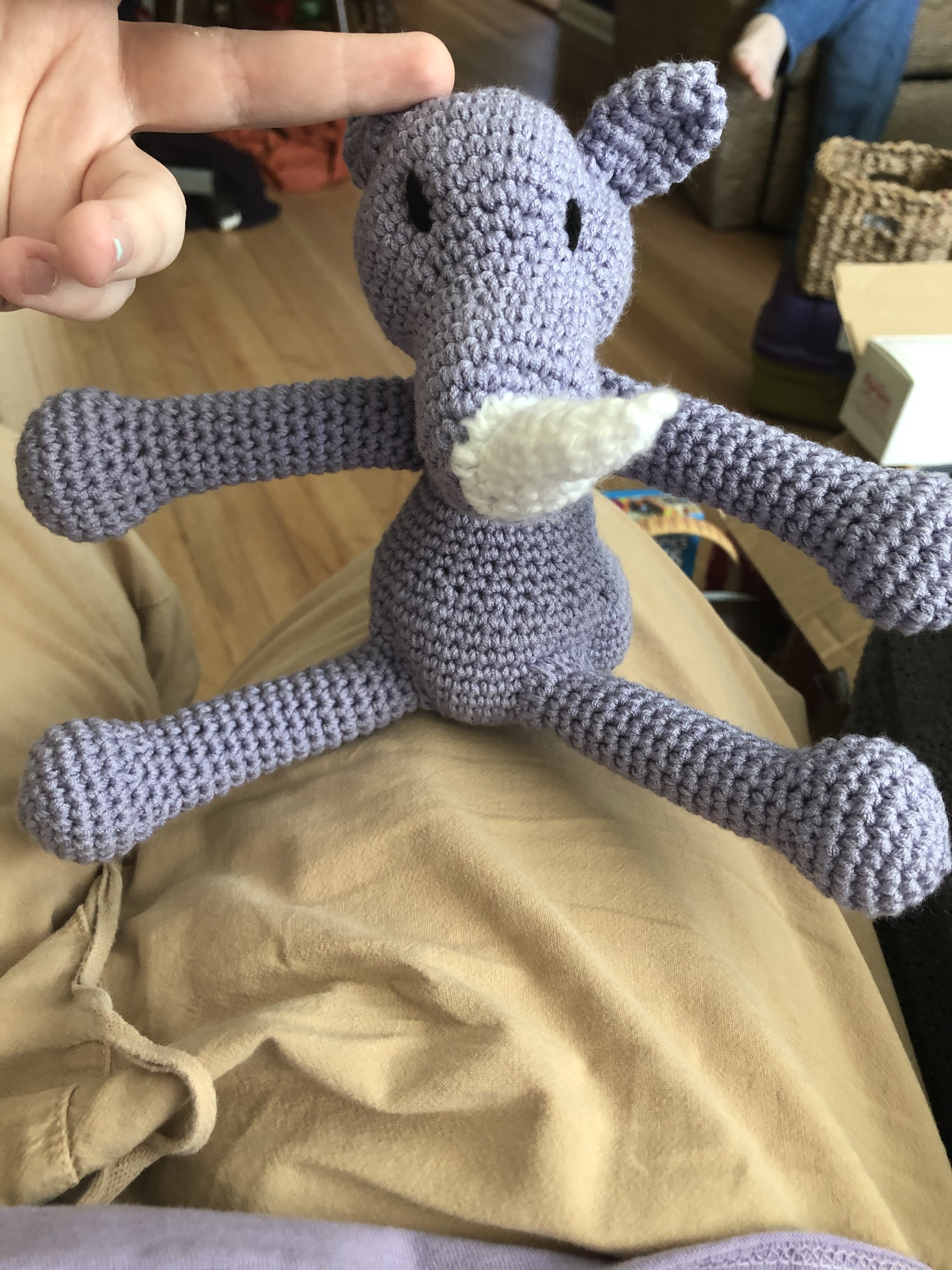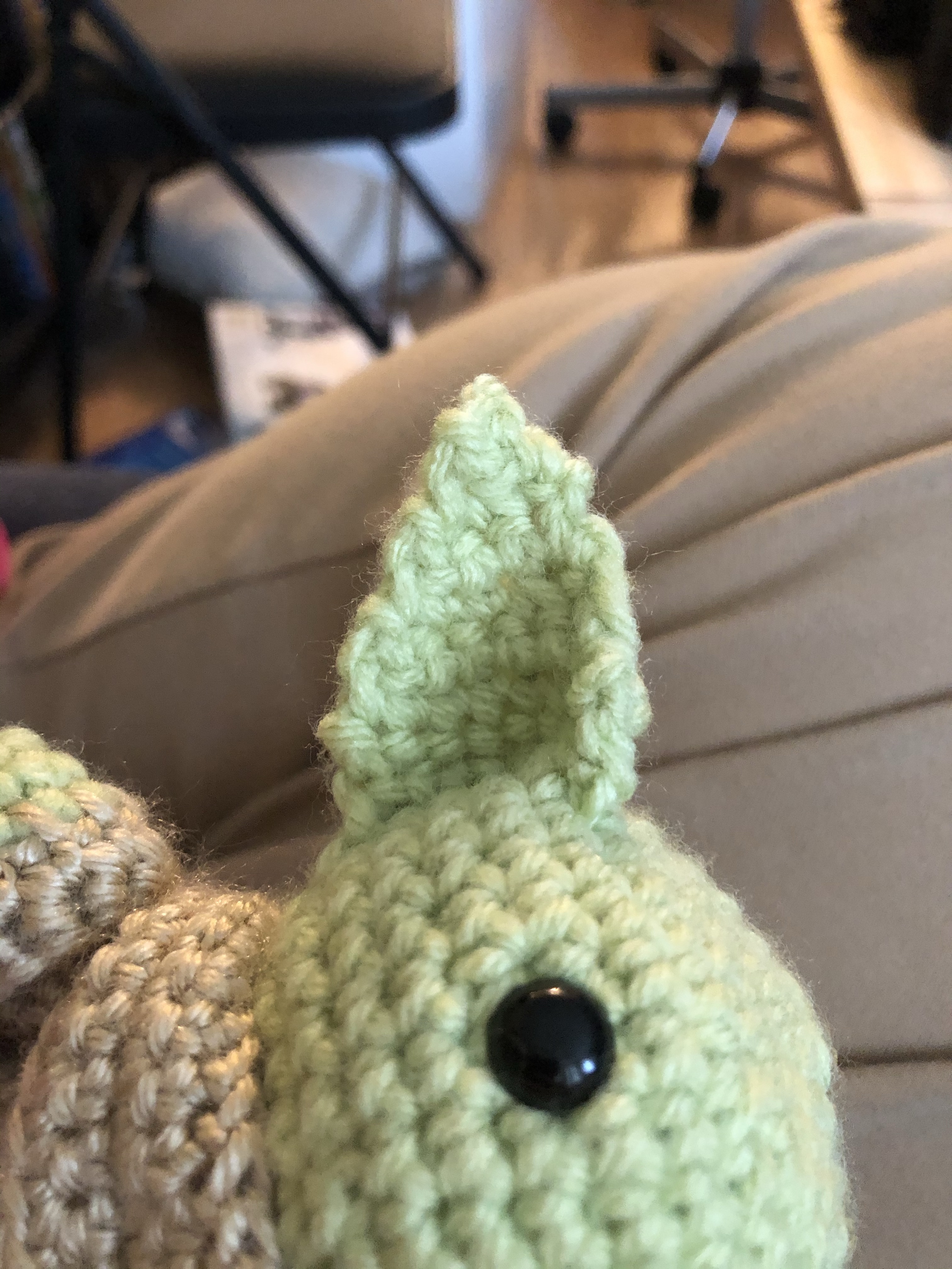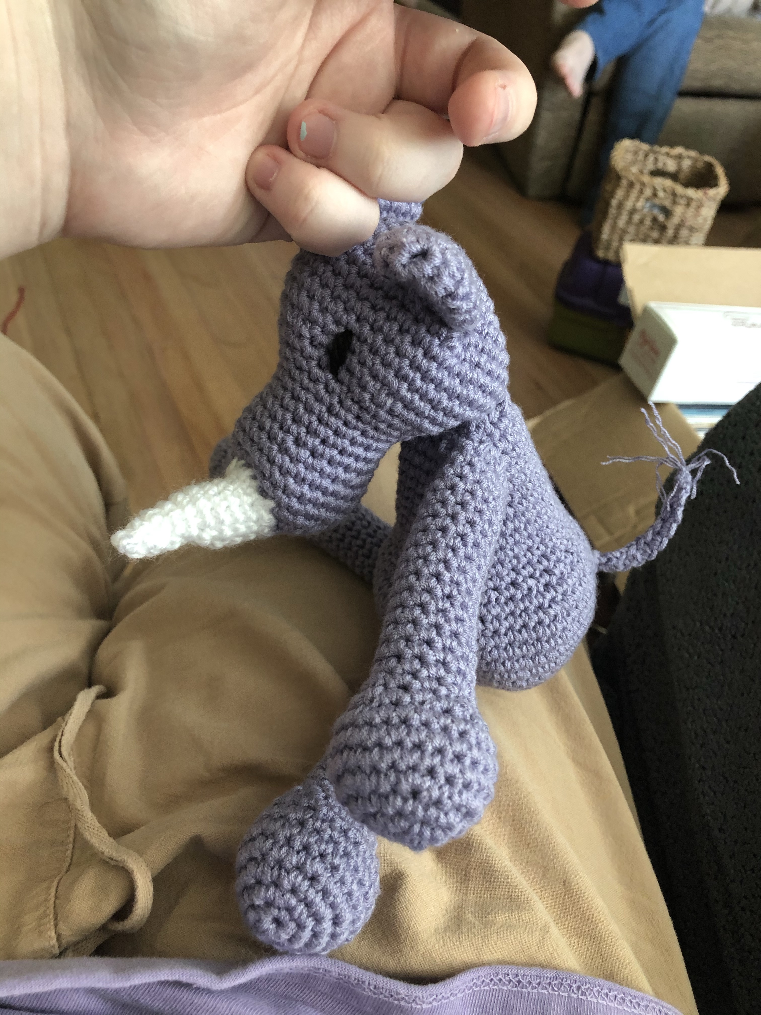 Don’t try to crochet too much in the early days of a global pandemic while ALSO, a hotly-anticipated game comes out and you binge-play it. Tendonitis is not fun. At all. But after a couple months of PT and a couple months of not pushing myself too hard as I got back into the swing of things, I finally did a new project! This little buddy is intended for the recipient of that flying saucer mobile I made about a year and a half ago – an alien to match the flying saucer, meaning it’s green with a big round head and side fins. Apart from that, though, I could design it however I wanted. I’m quite happy with how it turned out! Decided to make it a bit more fantasy and make a purple space suit – the raised purple ‘collar’ is supposed to be where a helmet would go. To give it some support, it also has three little legs on which to rest, which allow it to stand up unsupported! Very pleased with that.
