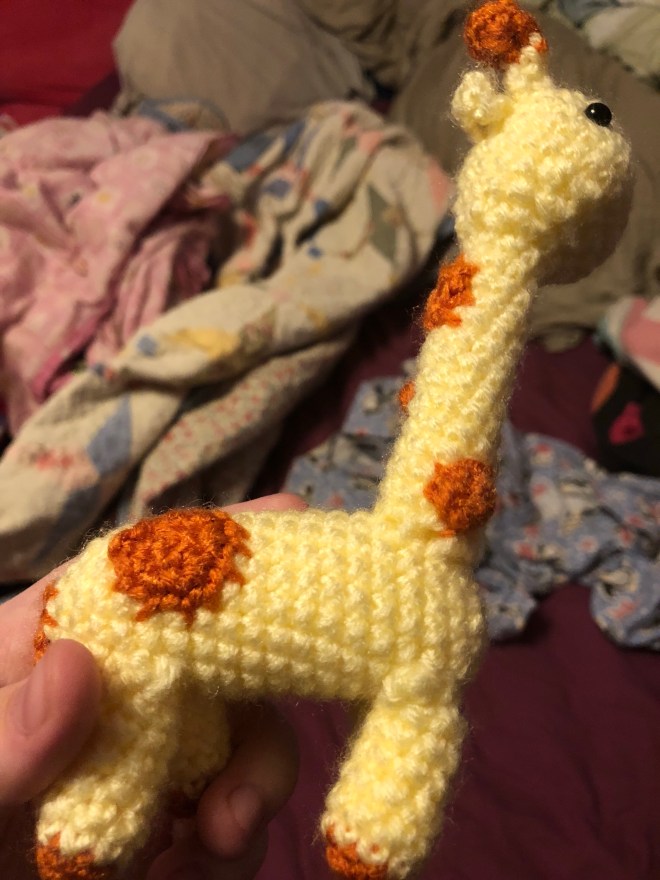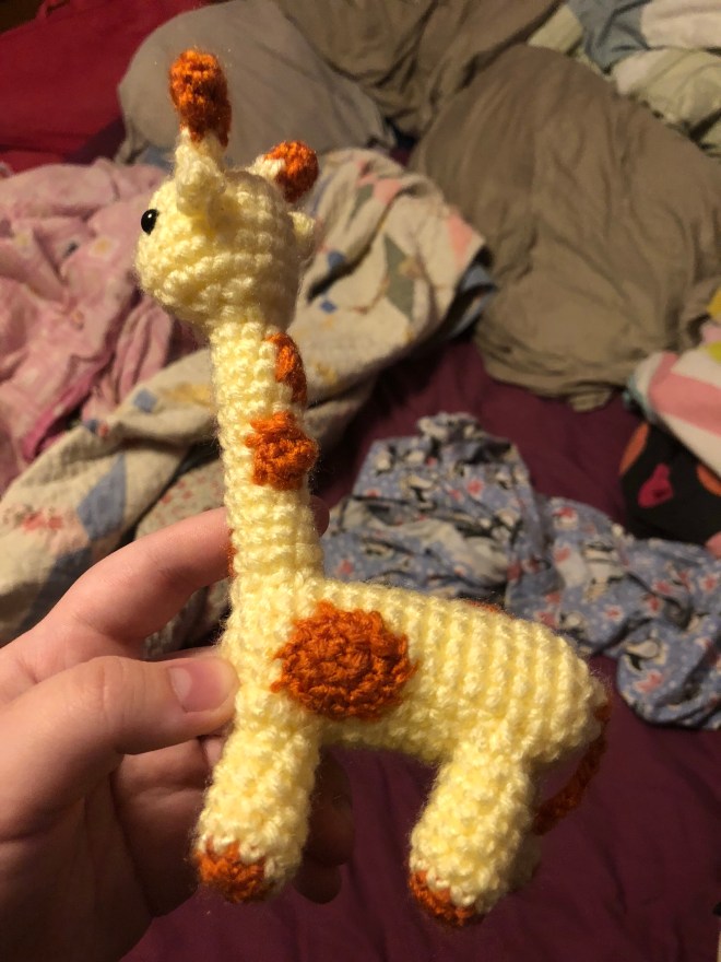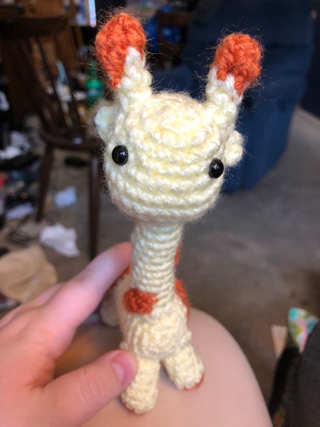 Planning on moving on to other patterns next. Haven’t quite decided which one, exactly, but there have been plenty of books I’ve gotten and done nothing with yet – in addition to my personal set of amigurumi here, I also made a set for the elementary school media center I volunteered yet this year, which I was working on from late January to early June. This giraffe is actually the second one I’ve made – the first one turned out well, so when I realized I didn’t have the time before the school year let out to make a second, I threw the first one in so I could make a personal one on my own time. It and the lion are my favorite patterns.