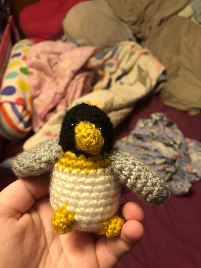 Small and quick to work up, but very cute. Even if the black yarn in the head makes things like counting stitches difficult. Turned out well, but there was an issue in how I stitched the bottom closed so it has issues sitting up on its own. Still adorable.