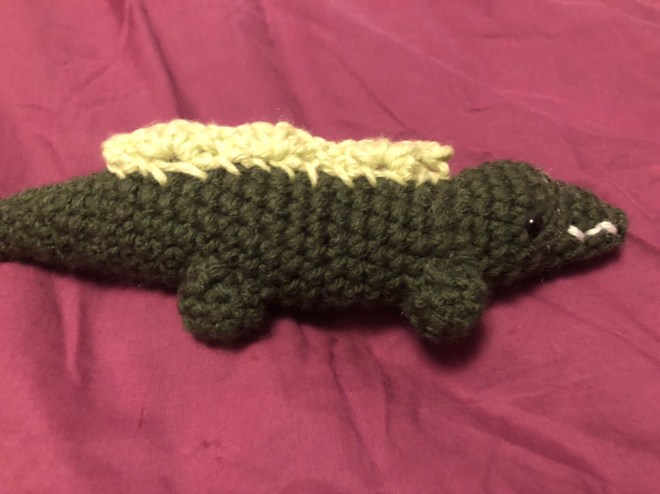 Next up is the gator, who I have actually named. His name is Snouty. I love him but don’t really have further comments, though I did modify the ridge on his back from the pattern to look more obviously differentiated.