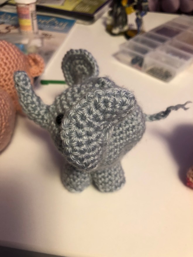 I volunteer at a local elementary school media center, and we can’t keep Mo Willems’ Elephant and Piggie books on the shelves. Naturally with all these pigs, they need an elephant. (Based on what I know of the series, though, he might not like being so outnumbered!) Both are made using Lion Brand Vanna’s Choice yarn, with some accenting Red Heart pink I had lying around from ages ago for the pigs’ snouts. Where safety eyes were used, I used 6060’s 9 mm black eyes.